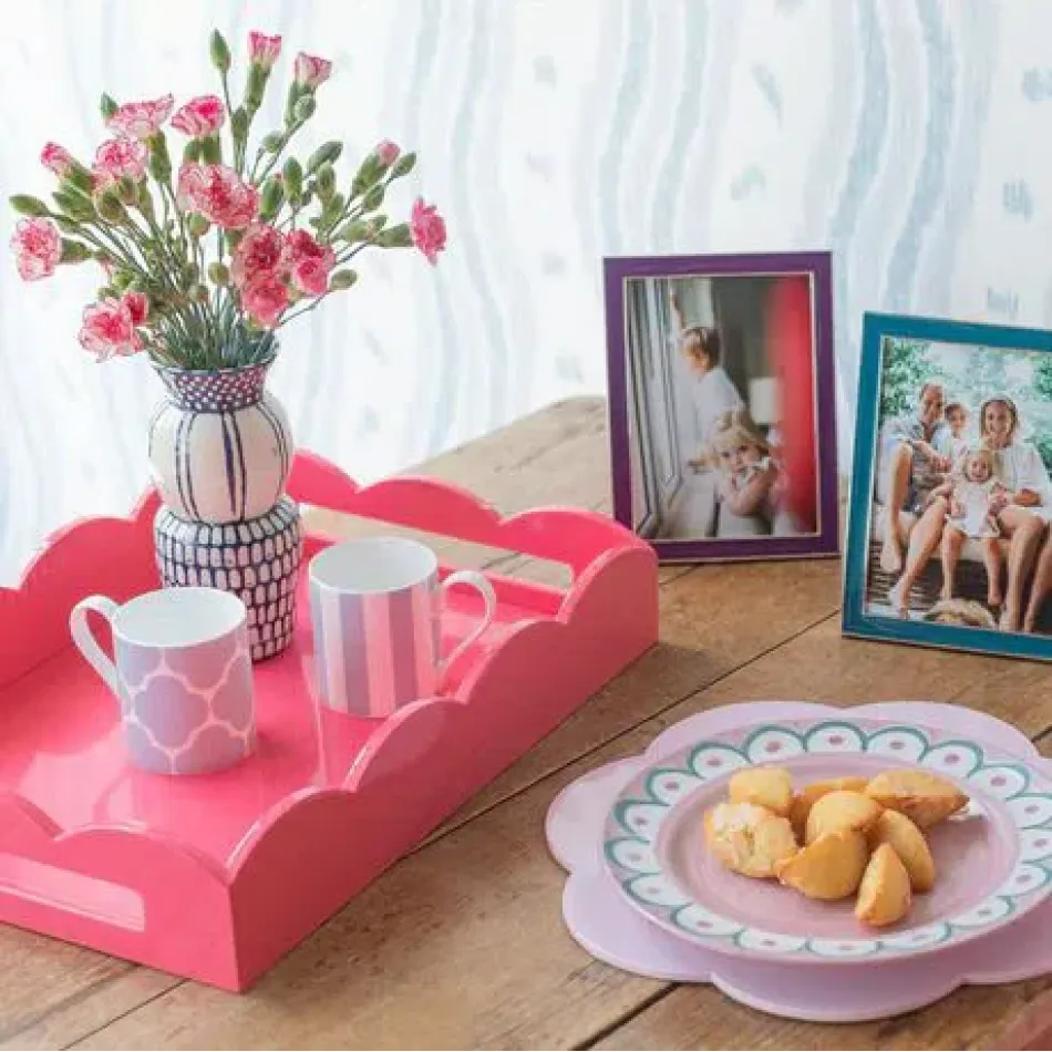 This set of 4 Pale Pink Scalloped Placemats is finished with 20 coats of high gloss lacquer, hand polished between each coat. They will beautifully complement any dining room or kitchen.