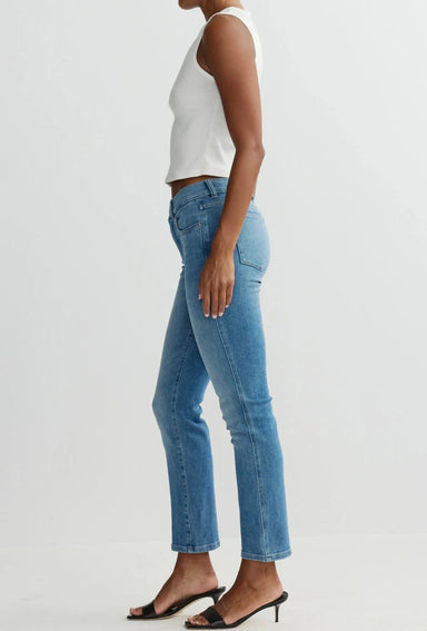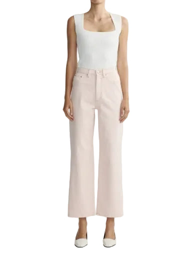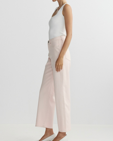 High rise Five-pocket style Fitted through the hip and thigh Full length Button/zip fly; belt loops Cotton Machine wash cold