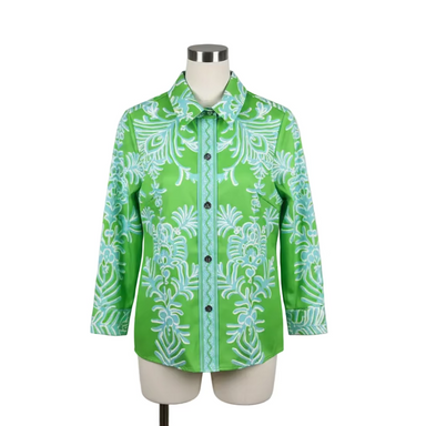 Elevate your wardrobe with this timeless button-down top featuring lustrous mother-of-pearl buttons and a striking contrast pattern running down th...