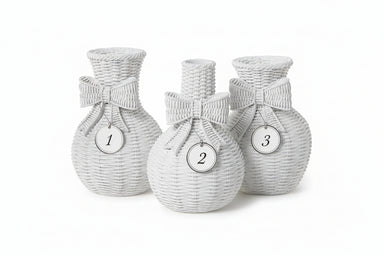 These elegant white vases feature a classic basket weave texture and delicate bow detail, adding a graceful touch to mantels, shelves, or tabletop ...