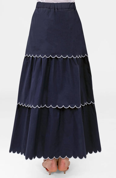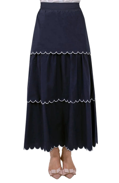 Crisp Cotton Scalloped Skirt Features Three Tiered Contrast Embroidered Scallops 36" Length Maxi Flat Front Elastic Waistband Lined Side Seam Pock...