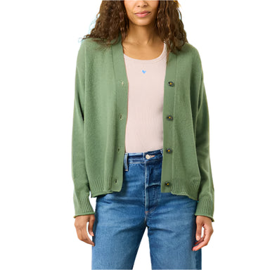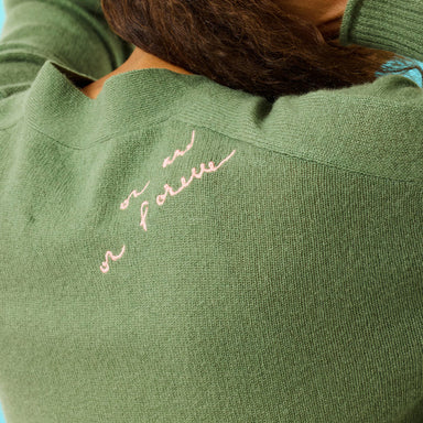 100% Featherweight Cashmere Body length is 23", size small Faux shell buttons for closure 'On and On Forever' embroidered in contrast color at bac...