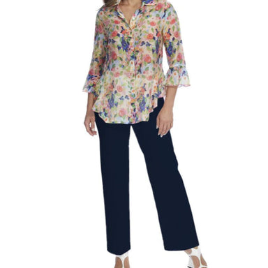 Pull-on compression elastic waistband (2 ¼”)• Angled side pockets• Stitched faux fly with top button closure• Ankle length• Inseam: 26”• Mid-rise