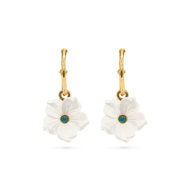 Our exquisitely detailed mother of pearl flowers dangle sweetly from classic golden hoops that hug your ear for a subtle sway of movement as you go...