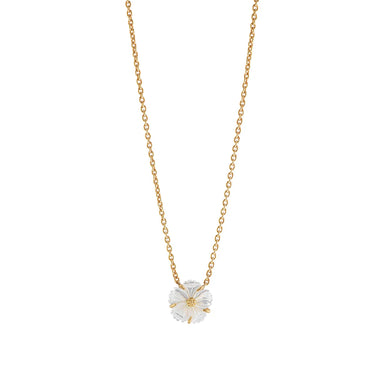 A single flower with ruffled petals in luminous, hand-carved mother of pearl shell with a golden berry center is the star of this dainty necklace t...
