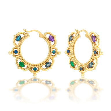 Not your average hoops, these statement earrings are embellished with colorful gemstones of blue labradorite, green onyx, and amethyst, framed with...