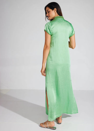 The Kris Dress features a collared neckline, short length puff sleeve with elastic cuff and a button front closure.