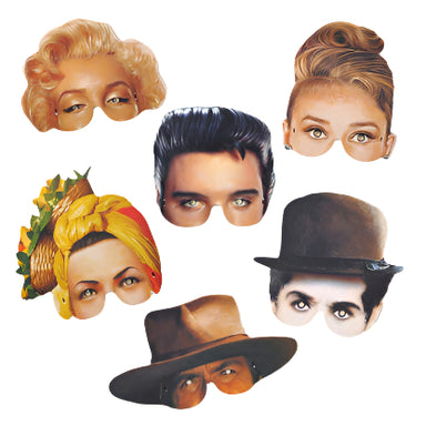 Six attractive icons of the twentieth century masks. Includes masks of Carmen Miranda, Charlie Chaplin, Audrey Hepburn, Elvis Presley, Clint Eastwo...