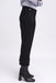 Plain cropped pants with cuffs at the bottom. Elastic adaptable fabric. Straight design. Medium shot. Invisible side pockets. Front closure with hidden zipper and metal button.