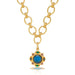 This medallion is fit for a queen, featuring a luminous blue labradorite center and Moorish arches bejeweled with amethyst, blue labradorite, and green onyx gemstones that bring bold color and opulence to any chain you wish to embellish. Festooned with intricate golden details throughout—from the ornate Byzantine silhouettes to the braided trim—this regal piece is sure to cause a stir wherever you take it.