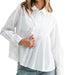 The Josh Top is a relaxed button-down top in a lightweight cotton poplin fabric. Features a classic collar, long sleeves with cuffs, and soft pleated detailing at the front and back for an easy, flowy fit. Button closure in the back with pleating. Perfect for professional polished work look or a casual everyday fit.