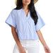The Thomas & Lourdes London Top in Diamond Stripe offers refined elegance with its cropped silhouette and flattering v-neckline. Banded sleeves add a polished finishing touch, while the sophisticated diamond stripe pattern brings visual interest to your wardrobe. This versatile piece pairs beautifully with the Hailey skirt for a coordinated look. Care for your top with a gentle wash and hang to dry, or opt for dry cleaning to maintain its pristine condition.
