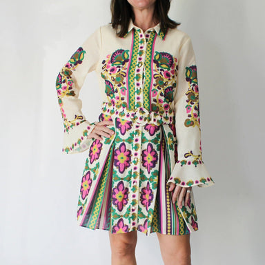 Featuring a crisp cream base adorned with a fun, eye-catching pattern, this dress brings instant personality to your wardrobe. The charming collare...