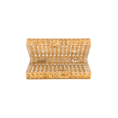 This cork clutch has gold accents and a bamboo closure. It has an optional gold chain strap and measures 8" x 5" x 1.5".
