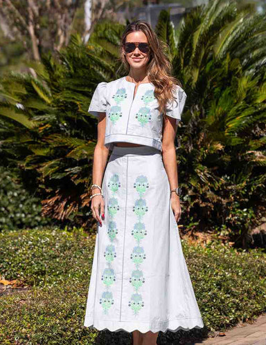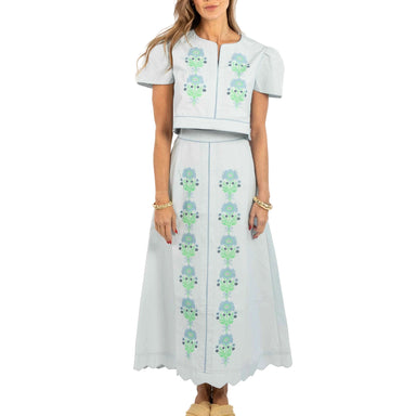 This button-down maxi dress is perhaps the most flattering silhouette in the repertoire! The Henrietta flowers shine brightest set against an emer...