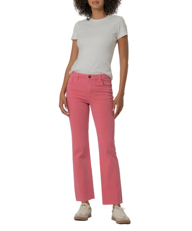 Elevate your denim game with these high-rise ankle flares in a vibrant flamingo pink hue. Crafted from a breathable cotton-rayon blend with just th...
