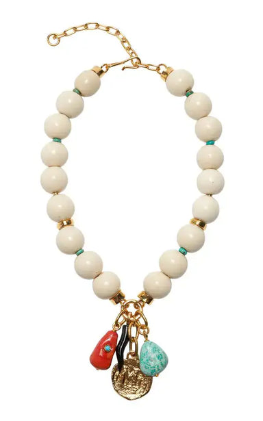 Find your beach bliss in a mixed-medium statement collar necklace with recycled bone, turquoise, flame-worked emerald-colored glass, crystal quartz...