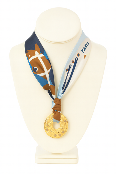 Elevate your ensemble with the Knotted Twilly featuring a delicate Circle Medallion. Designed with rich fall colors, this accessory adds a refined ...