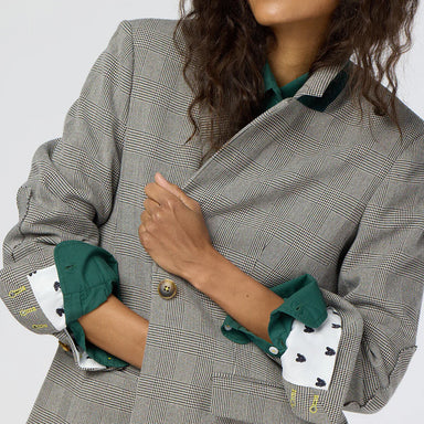 76% Poly, 20% Rayon, 4% Spandex 27.5" front length (size small) The blazer is lined with Kerri's pop heart artwork The back neck exterior collar ...