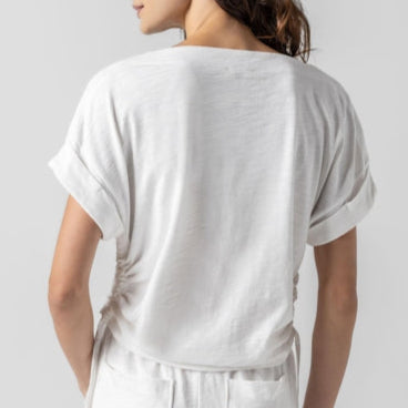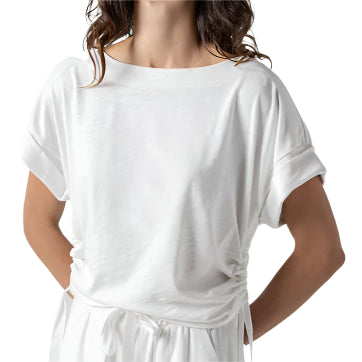 The Ruched Side Boatneck in our midweight Textured Knit fabric has dropped shoulders and adjustable draw cords at the sides creating beautiful drap...