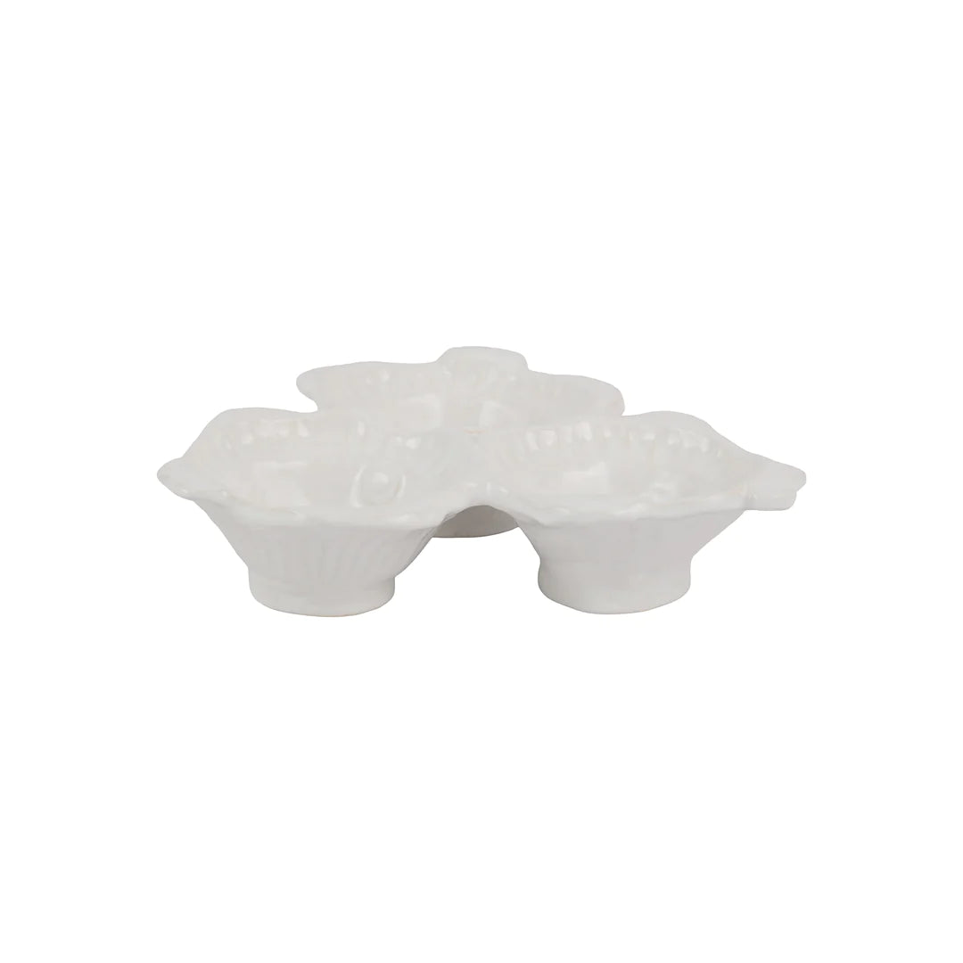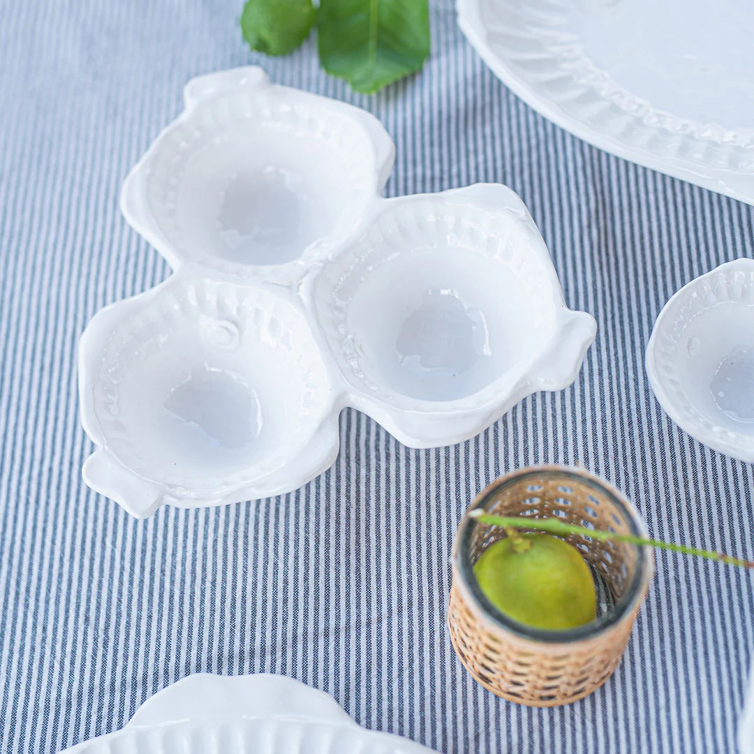 Playing off the hand-pressed edges of Pietra Serena, the Pesca Serena Three-Part Server has charming fish details to create a playful yet sophisticated coastal table.