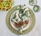 Watercolor Ikat Napkin in Olive Set of 4 by Kim Seybert. The Watercolor Ikat Napkin is an homage to the traditional Indonesian Ikat pattern. A hand-painted, magnified section of an Ikat pattern is printed digitally on the linen napkin.