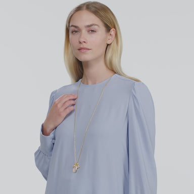 24K gold plate, imported glass, mother of pearl Length: 36 inches or 18 inches doubled Closes with lobster clasp Pendant measures 1.41 inches