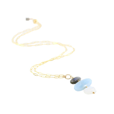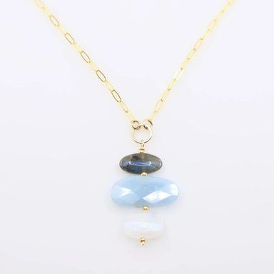 This pendant necklace displays a gently tiered stack of Milky Aquamarine, Rainbow Moonstone, and Labradorite gemstones on handmade rosary wrap link...