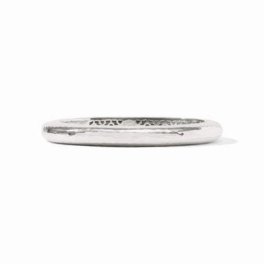 Pure silver plate (tarnish-free) Inner circumference: 7 inches Width: 0.3 inches Closes with spring hinge Julie Vos hallmark