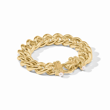 24K gold plate, glass pearl Length: 8 inches (regular), 8.3 inches (large) Width: 0.6 inches Closes with fold over clasp Julie Vos hallmark