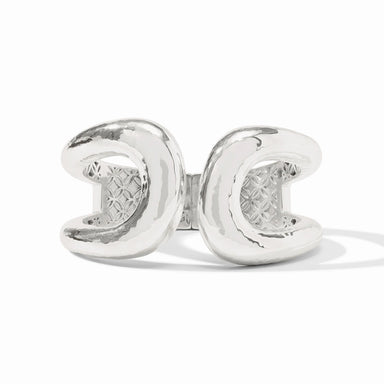 Pure silver plate (tarnish-free) Inner circumference: 7.1 inches Width: 1.3 inches Closes with spring hinge Julie Vos hallmark
