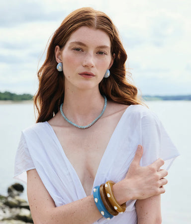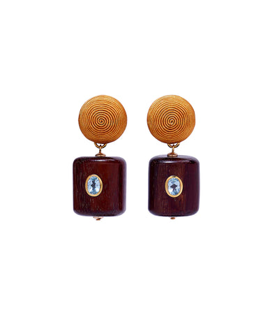 Gold-plated brass, wood, mother-of-pearl, aqua chalcedony Sterling silver posts Drop: 1.5“