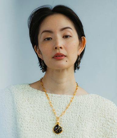 Gold-plated brass, enamel, mother-of-pearl, lemon quartz Sterling silver posts Drop: 1"