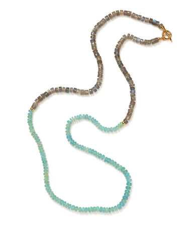 Gold-plated brass, heat-treated Ethiopian blue opal, labradorite Length: 32.5" Labradorite is a soft, delicate stone and will chip upon significan...
