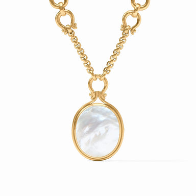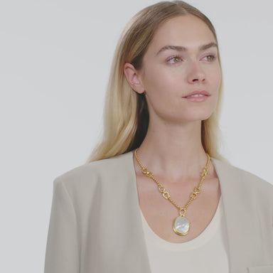 This equestrian-inspired necklace is a Triple Crown winner, featuring a mother of pearl pendant dangling from a dramatic chain of golden horsebits ...
