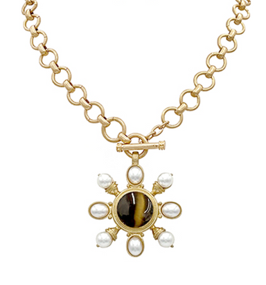 Pearl & Round Stone Necklace - Brown/Gold