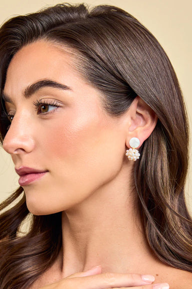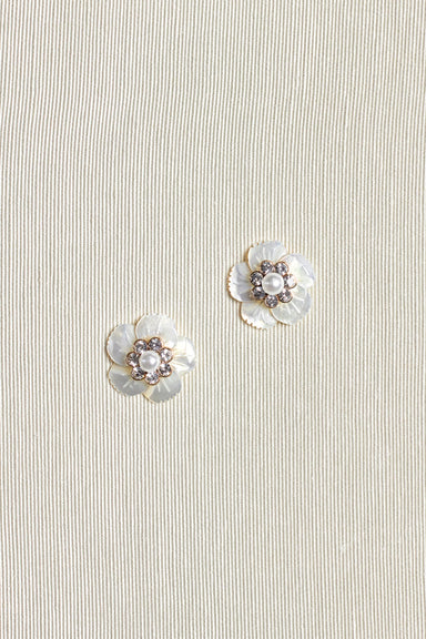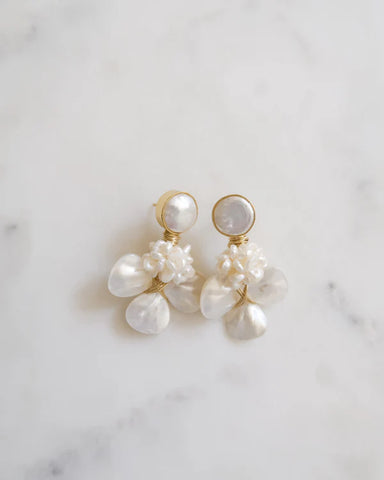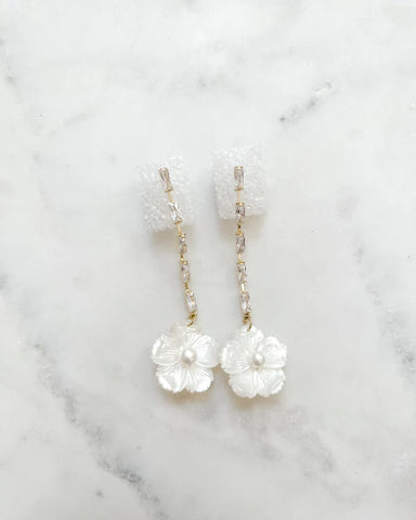Mother of pearl petalsPearl center and acrylic dropLightweight for all-day wearPerfect for bridesmaids and bridesApprox. 1.5"