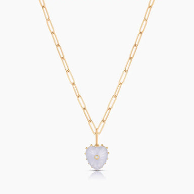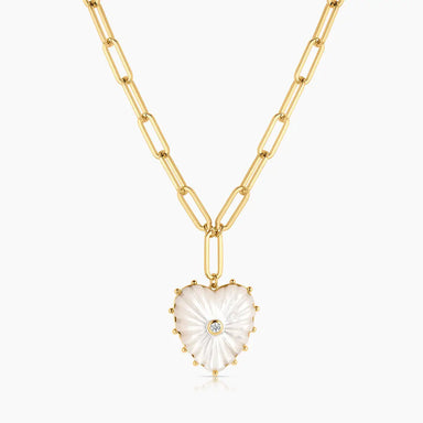 14k gold plated carved mother of pearl heart charm with cubic zirconia on 3.4 mm Finn medium elongated chain necklace. Fully adjustable up to 18". ...