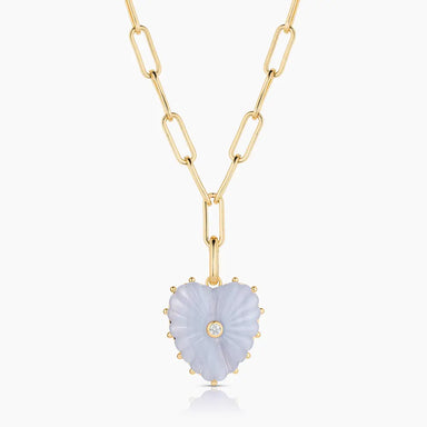 14k gold carved blue lace agate heart charm with cubic zirconia on 3.4 mm Finn medium elongated chain necklace. Fully adjustable up to 18". PRODUCT...