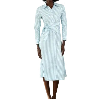 1/2 button front Tie waist Contrast piping 3/4 sleeves Classic collar Fully lined A-line silhouette Side pockets 100% Denim Cotto...