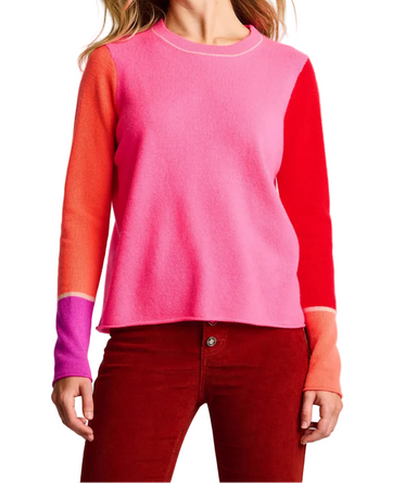 100% Cashmere Crew neck Set in sleeves Contrast color block sleeves and cuffs Rolled bottom edge