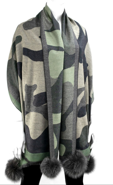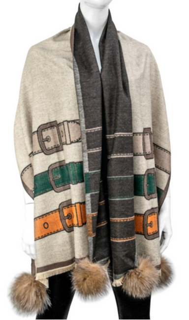 Knit wrap featuring a pull-through design adorned with elegant fox pom-poms.