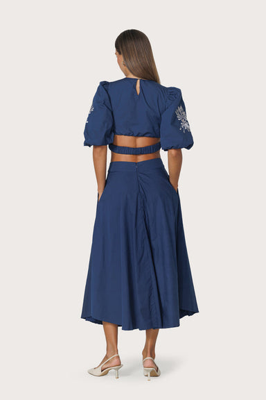 Featuring intricate embroidery throughout, this midi skirt is designed with a structured waistband, side pockets, and a concealed back zipper. Ful...