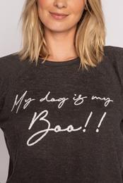 Women’s light mint 2-piece boxer set in baby peachy waffle with ornament print, long-sleeve top, and boxer shorts. 64% Polyester, 33% Rayon, 3% Ela...