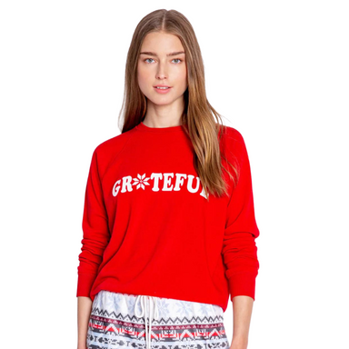 Women’s ivory brushed thermal pajama set with colorful holiday lettering, long-sleeve henley top with red buttons, jogger pants with red tie, and r...