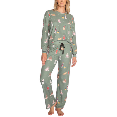 Women’s pink pajama set in baby peachy waffle with allover holiday dog print, long-sleeve crew top, and drawstring pants. 64% Polyester, 33% Rayon,...