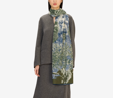 This exquisite scarf blends the cozy warmth of wool with the smooth elegance of silk, enhanced by the convenience of being washable. Featuring a ...