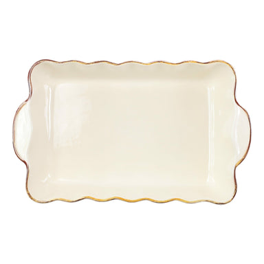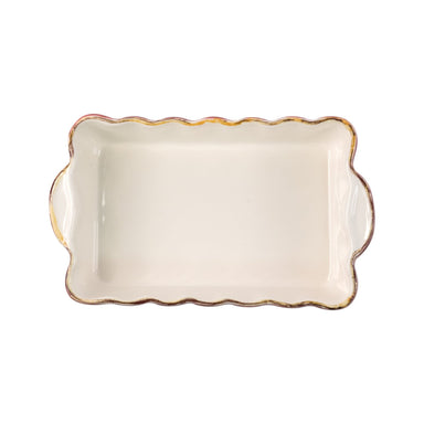 Dimensions: 13" L x 9" W x 2.5" H Materials: Porcelain with bamboo-shaped titanium gold handles Care Instructions: Oven-safe to 500°F; Dishwasher S...