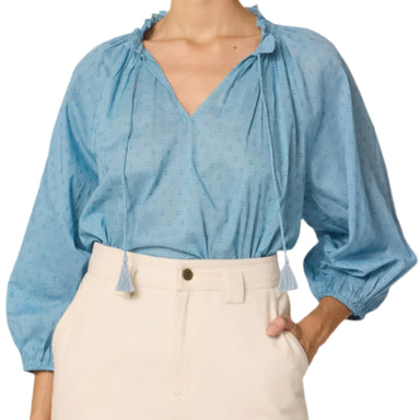 100% Cotton Denim Made in India Button front shirt with double pockets, puff sleeve, slight v, ruffle at neckline Classic KR fit, take your siz...