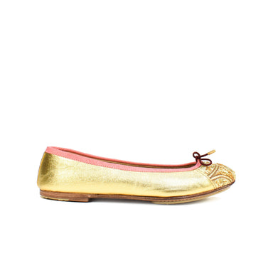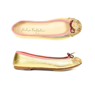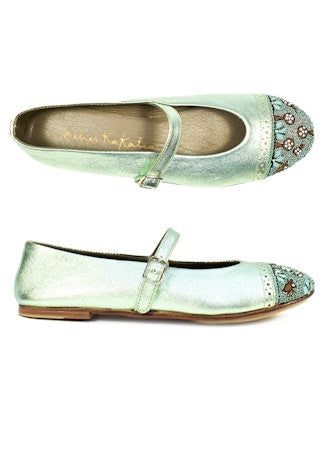 Each BIZI Ballerina is hand-embroidered in leather by women who have been embroidering shoes for the Moghul royalty for over 400 years. Metal coils...